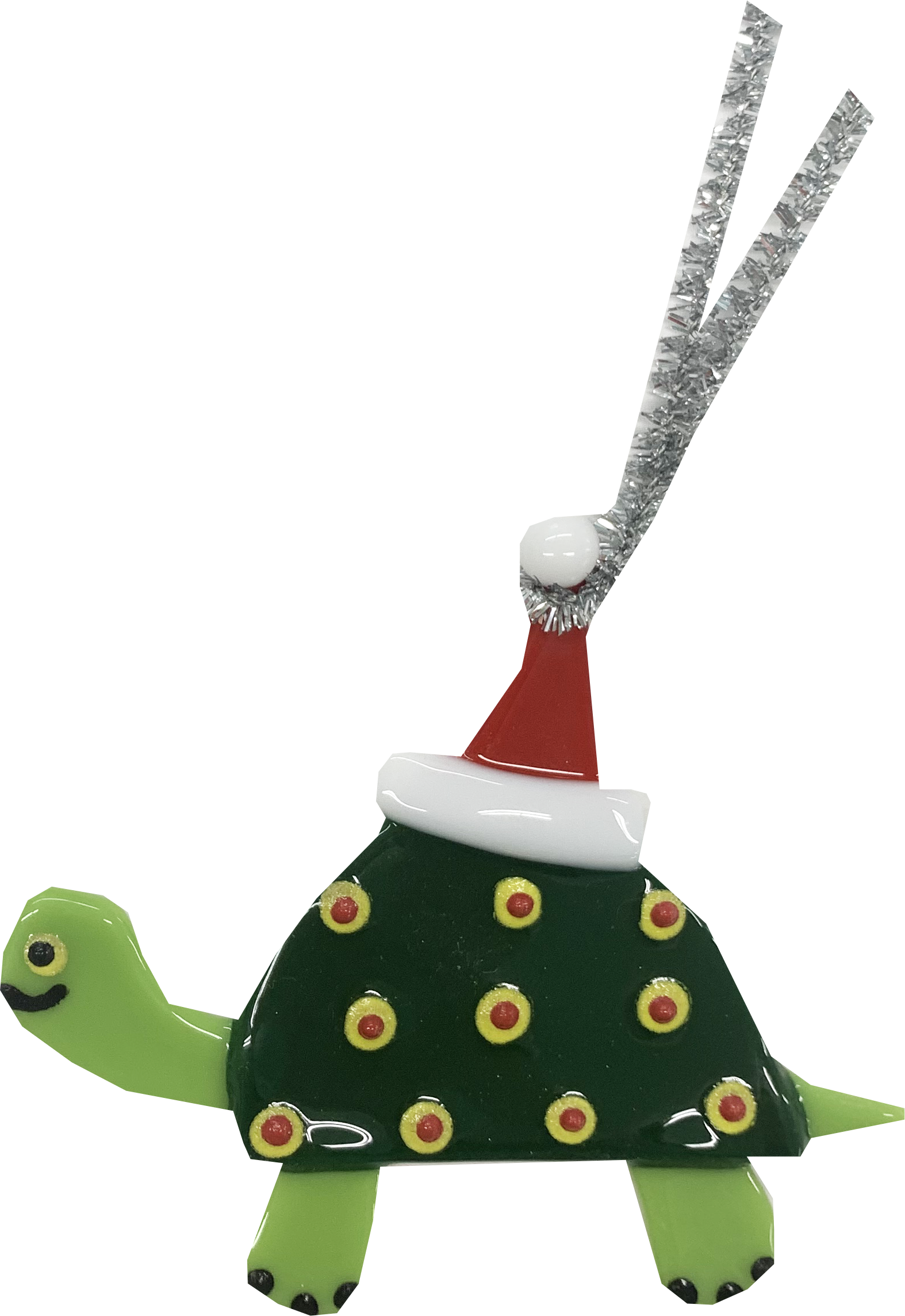 Small, Green Festive Land Turtle Ornament with silver hanger. Our products are each hand-made and each one is slightly different. The product you receive will be slightly different from the one pictured here.