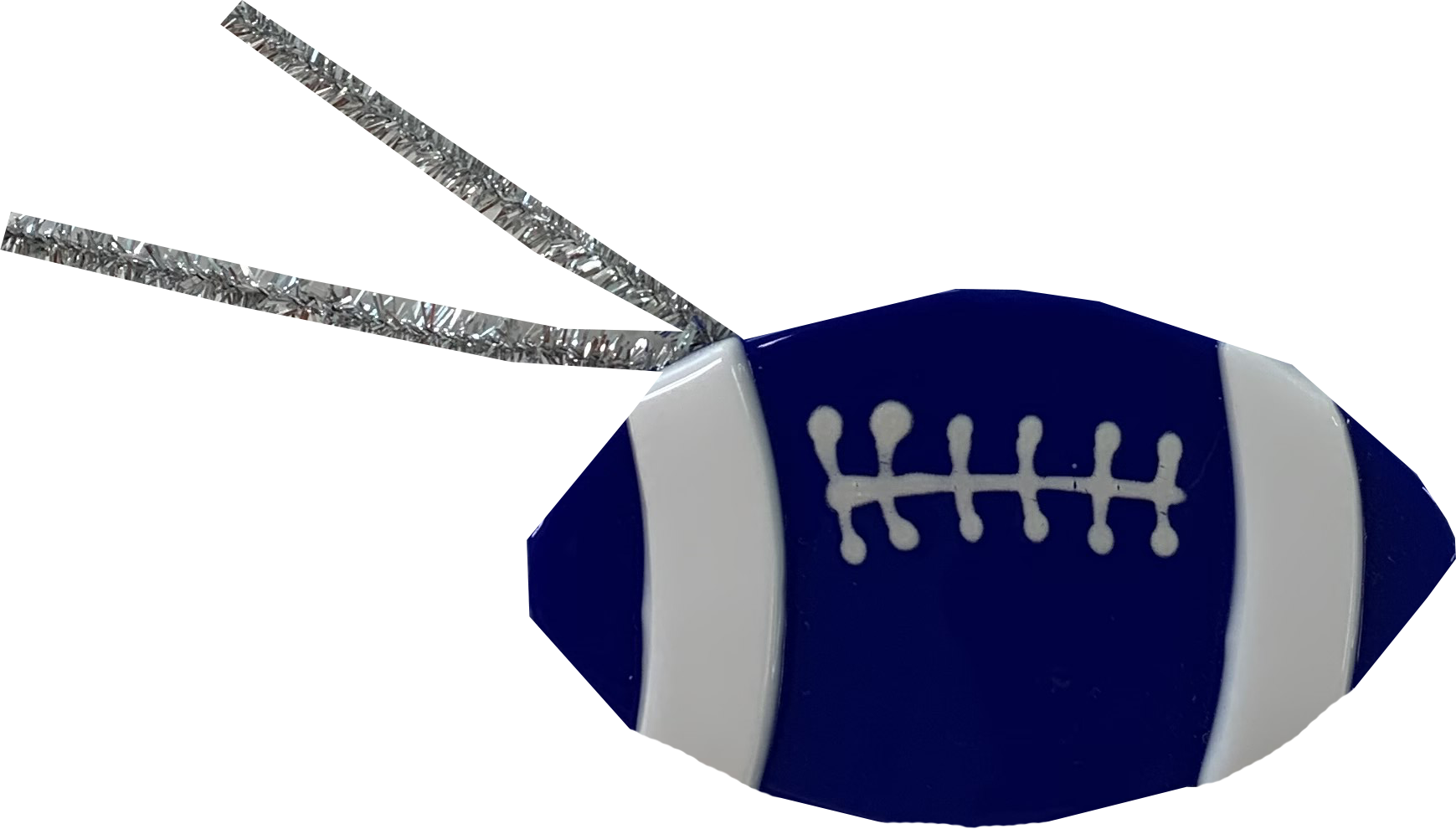 Small, Blue Football Ornament with silver hanger. Our products are each hand-made and each one is slightly different. The product you receive will be slightly different from the one pictured here.