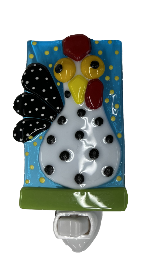 White And Black Rooster Nightlight. Our products are each hand-made and each one is slightly different. The product you receive will be slightly different from the one pictured here.